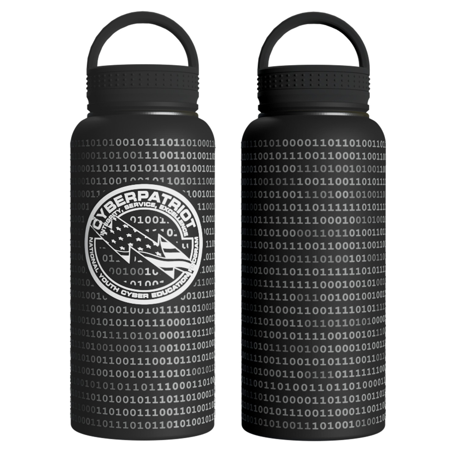 This is the 32 ounce stainless steel insulated CyberPatriot bottle. The bottle features the CyberPatriot logo in white on the front and various binary coating the sides. Larger format, perfect for all-day hydration.